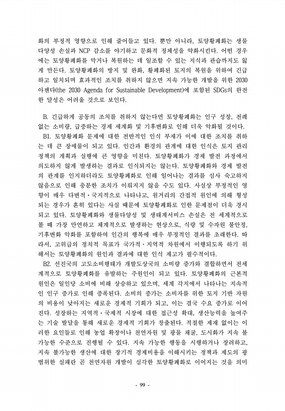 화의 부정적 영향으로 인해 줄어들고 있다. 뿐만 아니라, 토양황폐화는 생물 다양성 손실과 NCP 감소를 야기하고 문화적 정체성을 약화시킨다. 어떤 경우 에는 토양황폐화를 막거나 복원하는 데 일조할 수 있는 지식과 관습까지도 잃 게 만든다. 토양황폐화의 방지 및 완화, 황폐화된 토지의 복원을 위하여 긴급 하고 일치되며 효과적인 조치를 취하지 않으면 지속 가능한 개발을 위한 2030 아젠다 the 2030 Agenda for Sustainable Development 에 포함된 SDGs의 완전 한 달성은 어려울 것으로 보인다. B. 긴급하게 공동의 조치를 취하지 않는다면 토양황폐화는 인구 성장, 전례 없는 소비량, 급증하는 경제 세계화 및 기후변화로 인해 더욱 악화될 것이다. B1. 토양황폐화 문제에 대한 전반...