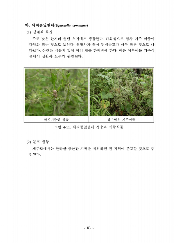 83 마. 돼지풀잎벌레 Ophraella communa 1 생태적 특성 주로 낮은 산지의 열린 초지에서 생활한다. 다화성으로 점차 기주 식물이 다양화 되는 것으로 보인다. 생활사가 짧아 번식속도가 매우 빠른 것으로 나 타났다. 산란은 식물의 잎에 여러 개를 한꺼번에 한다. 여름 이후에는 기주식 물에서 생활사 모두가 관찰된다. 짝짓기중인 성충 갉아먹은 기주식물 그림 4-11. 돼지풀잎벌레 성충과 기주식물 2 분포 현황 제주도에서는 한라산 중산간 지역을 제외하면 전 지역에 분포할 것으로 추정된다.