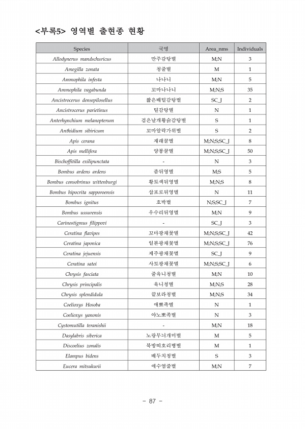 5 Species Area_nms Individuals Allodynerus mandschuricus M;N 3 Amegilla zonata M 1 Ammophila infesta ?? M;N 5 Ammophila vagabunda ? ?? M;N;S 35 Ancistrocerus densepilosellus SC_J 2 Ancistrocerus parietinus N 1 Anterhynchium melanopterum ? S 1 Anthidium sibiricum ? S 2 Apis cerana M;N;S;SC_J 8 Apis mellifera M;N;S;SC_J 50 Bischoffitilla exilipunctata N 3 Bombus ardens ardens M;S 5 Bombus consobrinu...