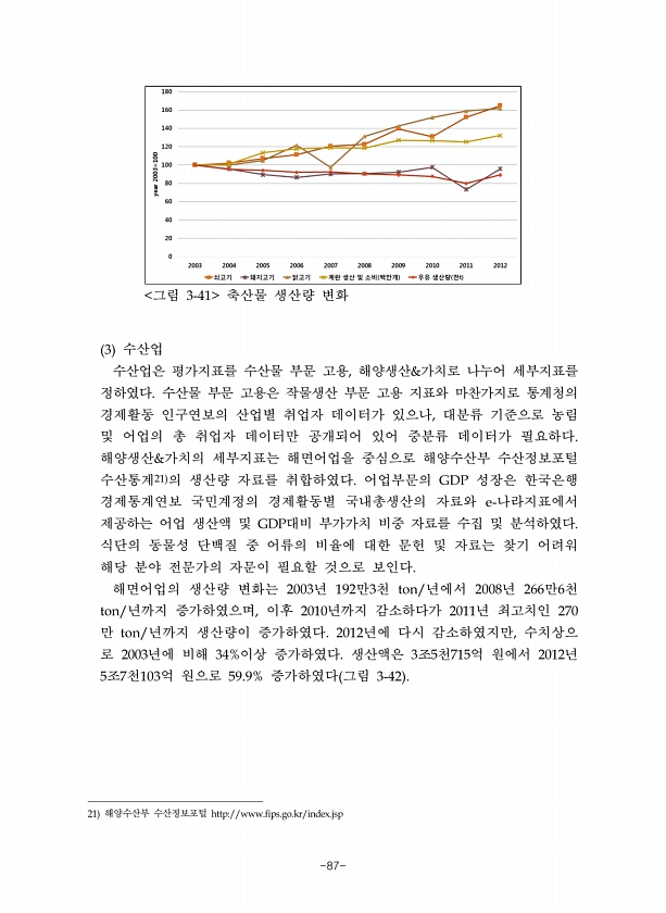 -87- 그림 축산물 생산량 변화 수산업 수산업은 평가지표를 수산물 부문 고용 해양생산 가치로 나누어 세부지표를 정하였다 수산물 부문 고용은 작물생산 부문 고용 지표와 마찬가지로 통계청의 경제활동 인구연보의 산업별 취업자 데이터가 있으나 대분류 기준으로 농림 및 어업의 총 취업자 데이터만 공개되어 있어 중분류 데이터가 필요하다 해양생산 가치의 세부지표는 해면어업을 중심으로 해양수산부 수산정보포털 수산통계 의 생산량 자료를 취합하였다 어업부문의 성장은 한국은행 경제통계연보 국민계정의 경제활동별 국내총생산의 자료와 나라지표에서 제공하는 어업 생산액 및 대비 부가가치 비중 자료를 수집 및 분석하였다 식단의 동물성 단백질 중 어류의 비율에 대한 문헌 및 자료는 찾기 어려워 해당 분야 전문가의 자문이 필요할 것으로 ...