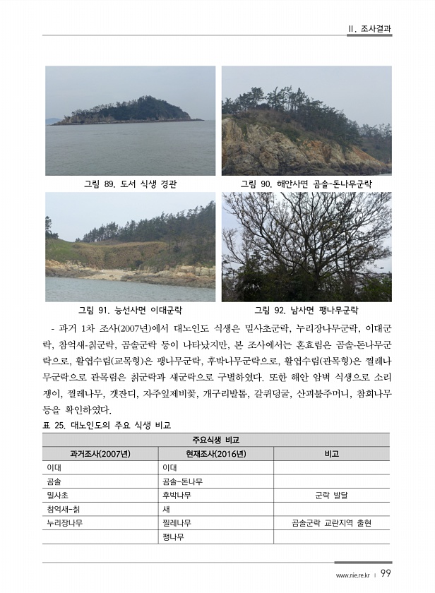 Ⅱ. 조사결과 www.nie.re.kr ? 99 그림 89. 도서 식생 경관 그림 90. 해안사면 곰솔-돈나무군락 그림 91. 능선사면 이대군락 그림 92. 남사면 팽나무군락 과거 1차 조사 2007년 에서 대노인도 식생은 밀사초군락, 누리장나무군락, 이대군 락, 참억새-칡군락, 곰솔군락 등이 나타났지만, 본 조사에서는 혼효림은 곰솔-돈나무군 락으로, 활엽수림 교목형 은 팽나무군락, 후박나무군락으로, 활엽수림 관목형 은 찔레나 무군락으로 관목림은 칡군락과 새군락으로 구별하였다. 또한 해안 암벽 식생으로 소리 쟁이, 찔레나무, 갯잔디, 자주잎제비꽃, 개구리발톱, 갈퀴덩굴, 산괴불주머니, 참회나무 등을 확인하였다. 표 25. 대노인도의 주요 식생 비교 주요식생 비교 과거조사 2007년 현재조사 2016년 비고 ...