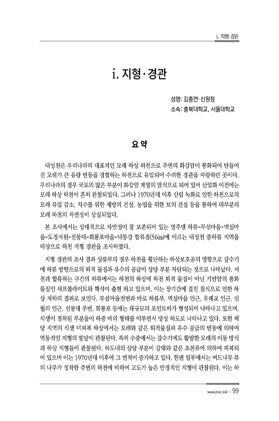 i. 지형·경관 www.nie.re.kr ? 99 i. · 성명김종연·신원정 소속충북대학교, 서울대학교 내성천은 우리나라의 대표적인 모래 하상 하천으로 주변의 화강암이 풍화되어 만들어 진 모래가 큰 유량 변동을 경험하는 하천으로 유입되어 수려한 경관을 자랑하던 곳이다. 우리나라의 경우 국토의 많은 부분이 화강암 계열의 암석으로 되어 있어 산업화 이전에는 모래 하상 하천이 흔히 관찰되었다. 그러나 1970년대 이후 산림 녹화로 인한 하천으로의 모래 유입 감소, 치수를 위한 제방의 건설, 농업을 위한 보의 건설 등을 통하여 대부분의 모래 하천의 자연성이 상실되었다. 본 조사에서는 상대적으로 자연성이 잘 보존되어 있는 영주댐 하류-무섬마을-멱실마 을-도정서원-선몽대-회룡포마을-낙동강 합류점 56㎞ 에 이르는 내성...