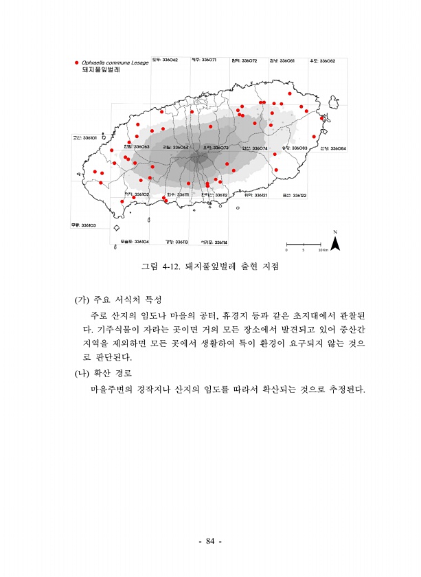 84 그림 4-12. 돼지풀잎벌레 출현 지점 가 주요 서식처 특성 주로 산지의 임도나 마을의 공터, 휴경지 등과 같은 초지대에서 관찰된 다. 기주식물이 자라는 곳이면 거의 모든 장소에서 발견되고 있어 중산간 지역을 제외하면 모든 곳에서 생활하여 특이 환경이 요구되지 않는 것으 로 판단된다. 나 확산 경로 마을주변의 경작지나 산지의 임도를 따라서 확산되는 것으로추정된다.