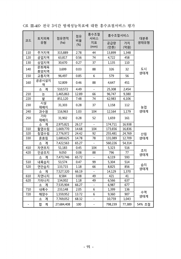 코드 토지피복 유형 점유면적 ha 점유 비율 % 홍수조절 서비스 지표 mm 홍수조절서비스 대분류 공급량 생태유형 만톤 가치 억원 110 주거지역 315,889 2.78 44 13,899 1,348 도시 생태계 120 공업지역 63,817 0.56 74 4,722 458 130 상업지역 30,670 0.27 37 1,135 110 140 문화체육 휴양지역 3,699 0.03 88 326 32 150 교통지역 96,497 0.85 6 579 56 160 공공시설지 역 52,809 0.46 88 4,647 451 소 계 510,572 4.49 25,308 2,454 210 논 1,465,863 12.89 66 96,747 9,380 농업 생태계 220 밭 851,120 7.48 74 62,983 6,106 230...