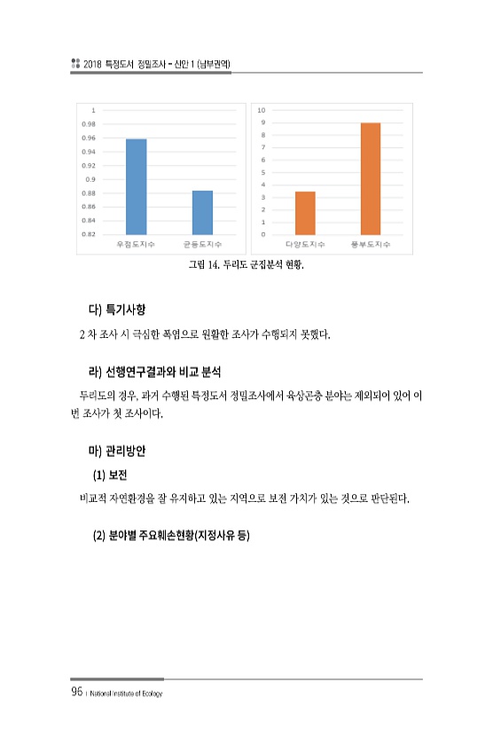 2018 특정도서 정밀조사 신안 1 남부권역 96 ? National Institute of Ecology 그림 14. 두리도 군집분석 현황. 2 차 조사 시 극심한 폭염으로 원활한 조사가 수행되지 못했다. 두리도의 경우, 과거 수행된 특정도서 정밀조사에서 육상곤충 분야는 제외되어 있어 이 번 조사가 첫 조사이다. 1 비교적 자연환경을 잘 유지하고 있는 지역으로 보전 가치가 있는 것으로 판단된다. 2