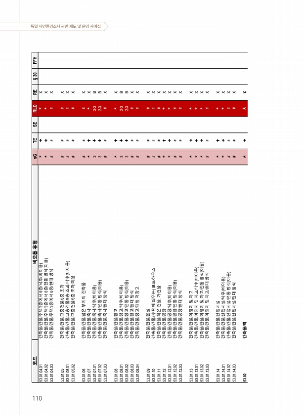 독일 자연환경조사 관련 제도 및 운영 사례집 코드 비오톱 유형 nG TE SE RLD RE § 30 FFH 53.01.04.01 건축물/건물/주택/3층에서 6층/낙후 비이용 ? ? ? X 53.01.04.02 건축물/건물/주택/3층에서 6층/전통 방식 이용 ? ? ? X 53.01.04.03 건축물/건물/주택/3층에서 6층/현대 방식 # # # X 53.01.05 건축물/건물/고층건물/6층 초과 # # # X 53.01.05.01 건축물/건물/고층건물/6층 초과/낙후 비이용 # # # X 53.01.05.02 건축물/건물/고층건물/6층 초과/이용 # # # X 53.01.06 건축물/건물/넓은 부지의 건축물 # # # X 53.01.07 건축물/건물/축사 ? ? ? X 53.01.07.01 건축물/건물/축사...
