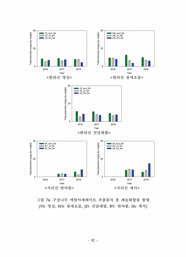 92 한라산 영실 한라산 윗세오름 한라산 진달래밭 지리산 반야봉 지리산 세석 그림 74. 구상나무 에틸아세테이트 추출물의 총 페놀화합물 함량 YS영실, WS윗세오름, JD진달래밭, BY반야봉, SS세석