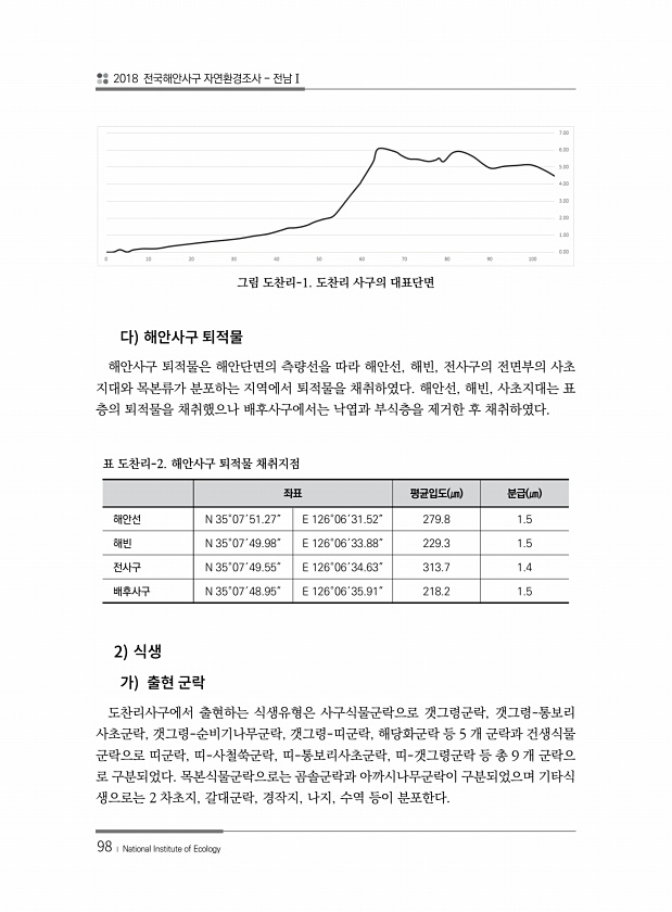 2018 전국해안사구 자연환경조사 전남Ⅰ 98 ? National Institute of Ecology 그림 도찬리-1. 도찬리 사구의 대표단면 해안사구 퇴적물은 해안단면의 측량선을 따라 해안선, 해빈, 전사구의 전면부의 사초 지대와 목본류가 분포하는 지역에서 퇴적물을 채취하였다. 해안선, 해빈, 사초지대는 표 층의 퇴적물을 채취했으나 배후사구에서는 낙엽과 부식층을 제거한 후 채취하였다. 좌표 평균입도 ㎛ 분급 ㎛ 해안선 N 35°07′51.27″ E 126°06′31.52″ 279.8 1.5 해빈 N 35°07′49.98″ E 126°06′33.88″ 229.3 1.5 전사구 N 35°07′49.55″ E 126°06′34.63″ 313.7 1.4 배후사구 N 35°07′48.95″ E 126°06′35....