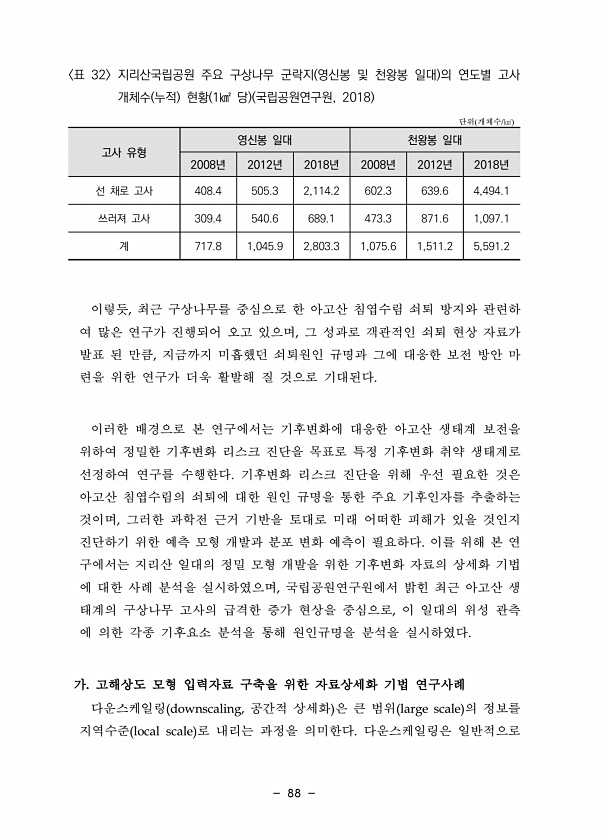88 단위 개체수/㎢ 고사 유형 영신봉 일대 천왕봉 일대 2008년 2012년 2018년 2008년 2012년 2018년 선 채로 고사 408.4 505.3 2,114.2 602.3 639.6 4,494.1 쓰러져 고사 309.4 540.6 689.1 473.3 871.6 1,097.1 계 717.8 1,045.9 2,803.3 1,075.6 1,511.2 5,591.2 표 32 지리산국립공원 주요 구상나무 군락지 영신봉 및 천왕봉 일대 의 연도별 고사 개체수 누적 현황 1㎢ 당 국립공원연구원, 2018 이렇듯, 최근 구상나무를 중심으로 한 아고산 침엽수림 쇠퇴 방지와 관련하 여 많은 연구가 진행되어 오고 있으며, 그 성과로 객관적인 쇠퇴 현상 자료가 발표 된 만큼, 지금까지 미흡했던 쇠퇴원인 규명과 그에 ...