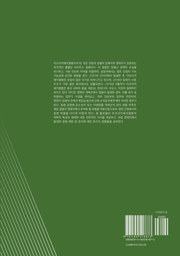 아프리카돼지열병 ASF 은 모든 연령과 성별의 집돼지와 멧돼지가 감염되는 파괴적인 출혈성 바이러스 질병이다. 이 질병은 엄청난 경제적 손실을 야기하고, 식량 안보와 무역을 위협하며, 감염국에서는 양돈 산업의 지속 가능성에 심각한 영향을 준다. 2007년 조지아에서 발생한 후, 아프리카 돼지열병은 유럽의 많은 국가로 퍼져나가고 있으며, 2018년 집돼지 사육 두수가 가장 많은 중국에서도 검출되었다. 2019년 8월까지 아프리카 돼지열병은 중국 내부와 몽골, 베트남, 캄보디아, 라오스, 미얀마 등에까지 퍼지고 있다. 어디든 멧돼지 개체군에서 질병이 발생한 경우, 이를 관리 및 박멸하는 업무가 국경을 뛰어넘고, 여러 담당부처 업무와 연관되며, 멧돼지-집돼지 관계의 복잡성 등으로 인해 수의당국에게 매우 어려운 업무...
