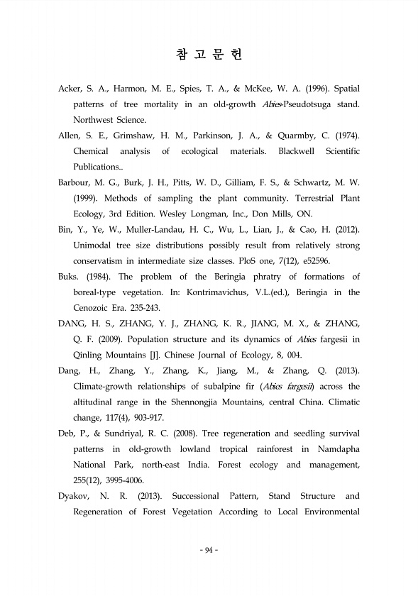 94 참 고 문 헌 Acker, S. A., Harmon, M. E., Spies, T. A., & McKee, W. A. 1996 Spatial patterns of tree mortality in an old-growth Abies-Pseudotsuga stand. Northwest Science. Allen, S. E., Grimshaw, H. M., Parkinson, J. A., & Quarmby, C. 1974 Chemical analysis of ecological materials. Blackwell Scientific Publications.. Barbour, M. G., Burk, J. H., Pitts, W. D., Gilliam, F. S., &?, M. W. 1999 Methods o...