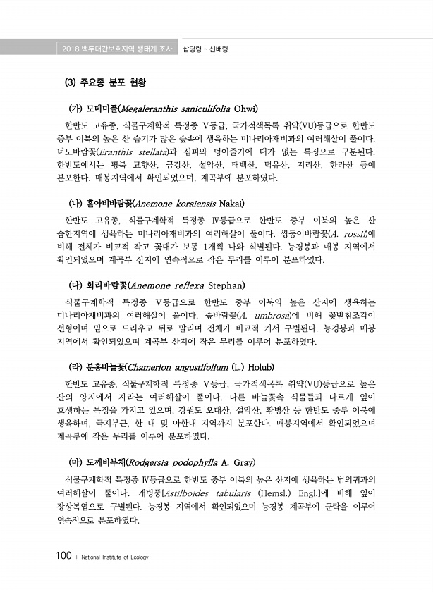 2018 백두대간보호지역 생태계 조사 삽당령 신배령 100 ? National Institute of Ecology 3 주요종 분포 현황 가 모데미풀 Megaleranthis saniculifolia Ohwi 한반도 고유종, 식물구계학적 특정종 Ⅴ등급, 국가적색목록 취약 VU 등급으로 한반도 중부 이북의 높은 산 습기가 많은 숲속에 생육하는 미나리아재비과의 여러해살이 풀이다. 너도바람꽃 Eranthis stellata 과 심피와 덩이줄기에 대가 없는 특징으로 구분된다. 한반도에서는 평북 묘향산, 금강산, 설악산, 태백산, 덕유산, 지리산, 한라산 등에 분포한다. 매봉지역에서 확인되었으며, 계곡부에 분포하였다. 나 홀아비바람꽃 Anemone koraiensis Nakai 한반도 고유종, 식물구계학적 특정종 Ⅳ...