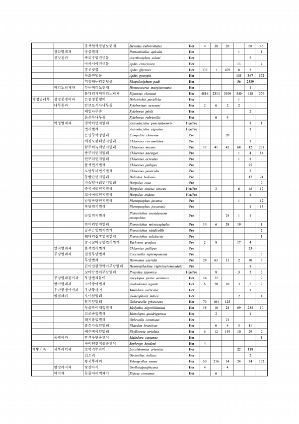 홍색얼룩장님노린재 Stenotus rubrovittatus Her 4 38 26 68 46 장삼벌레과 장삼벌레 Pentastiridius apicalis Her 1 1 진딧물과 싸리수염진딧물 Acyrthosiphon solani Her 5 아카시아진딧물 Aphis craccivora Her 13 4 콩진딧물 Aphis glycines Her 332 1 479 8 5 목화진딧물 Aphis gossypii Her 135 567 572 기장테두리진딧물 Rhopalosiphum padi Her 56 2539 허리노린재과 녹두허리노린재 Homoeocerus marginiventris Her 1 톱다리개미허리노린재 Riptortus clavatus Her 4816 2314 5109 540 418 376 딱정벌레목 검정...