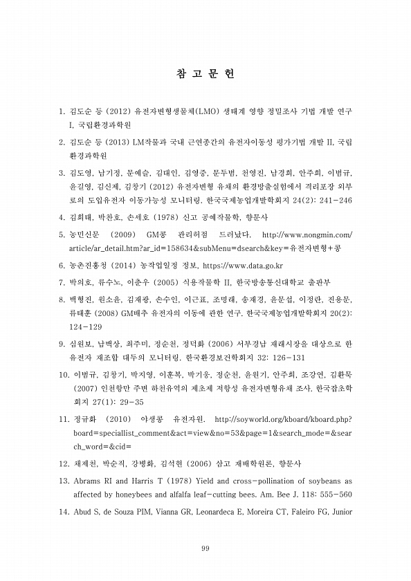 99 참 고 문 헌 1. 김도순 등 2012 유전자변형생물체 LMO 생태계 영향 정밀조사 기법 개발 연구 I, 국립환경과학원 2. 김도순 등 2013 LM작물과 국내 근연종간의 유전자이동성 평가기법 개발 II, 국립 환경과학원 3. 김도영, 남기정, 문예슬, 김대인, 김영중, 문두범, 천영진, 남경희, 안주희, 이범규, 윤길영, 김신제, 김창기 2012 유전자변형 유채의 환경방출실험에서 격리포장 외부 로의 도입유전자 이동가능성 모니터링. 한국국제농업개발학회지 24 2 241-246 4. 김희태, 박찬호, 손세호 1978 신고 공예작물학, 향문사 5. 농민신문 2009 GM콩 관리허점 드러났다. http//www.nongmin.com/ article/ar_detail.htm?ar_id=158634&subMen...