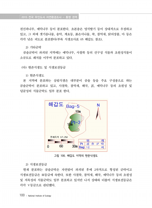 2015 전국 무인도서 자연환경조사 통영 권역 100 ? National Institute of Ecology 천선과나무, 예덕나무 등이 분포한다. 초본층은 멍석딸기 등이 상대적으로 우점하고 있고, 그 외에 갯기름나물, 송악, 계요등, 붉은서나물, 쑥, 참억새, 닭의장풀, 마 등은 각각 낮은 피도로 분포한다 부록 식생조사표 05 해갑도 참조 2 기타군락 곰솔군락이 파괴된 지역에는 예덕나무, 사철쑥 등의 선구성 식물과 초원성식물이 소규모로 패치를 이루며 분포하고 있다. 다 현존식생도 및 식생보전등급 1 현존식생도 본 지역에 분포하는 삼림식생은 대부분이 곰솔 등을 주요 구성종으로 하는 곰솔군락이 분포하고 있고, 사철쑥, 참억새, 해국, 칡, 예덕나무 등의 초원성 및 덩굴성의 식물군락도 일부 분포 한다. 그림 1...
