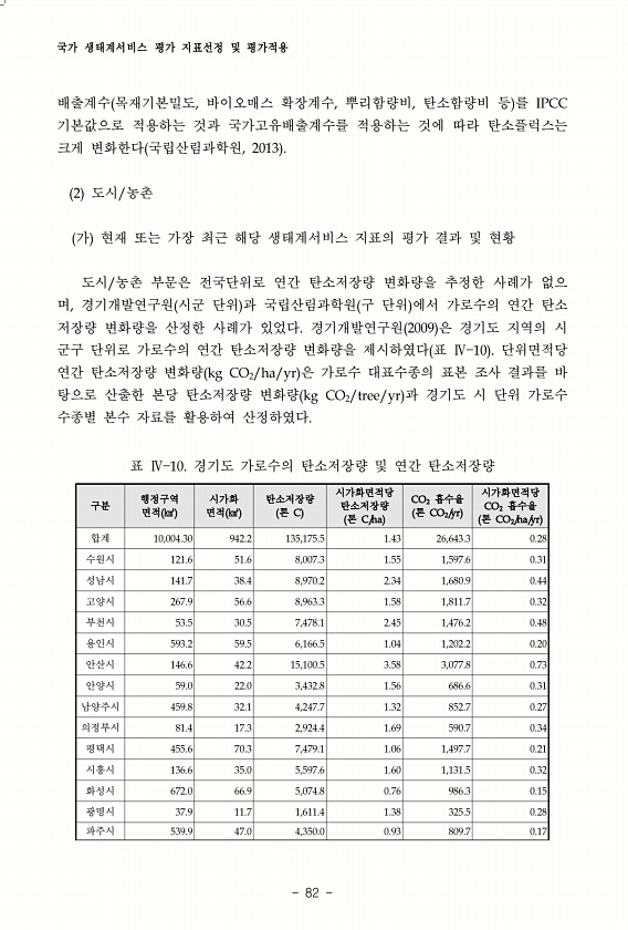 국가 생태계서비스 평가 지표선정 및 평가적용 82 배출계수 목재기본밀도, 바이오매스 확장계수, 뿌리함량비, 탄소함량비 등 를 IPCC 기본값으로 적용하는 것과 국가고유배출계수를 적용하는 것에 따라 탄소플럭스는 크게 변화한다 국립산림과학원, 2013 2 도시/농촌 가 현재 또는 가장 최근 해당 생태계서비스 지표의 평가 결과 및 현황 도시/농촌 부문은 전국단위로 연간 탄소저장량 변화량을 추정한 사례가 없으 며, 경기개발연구원 시군 단위 과 국립산림과학원 구 단위 에서 가로수의 연간 탄소 저장량 변화량을 산정한 사례가 있었다. 경기개발연구원 2009 은 경기도 지역의 시 군구 단위로 가로수의 연간 탄소저장량 변화량을 제시하였다 표 Ⅳ 10 단위면적당 연간 탄소저장량 변화량 kg CO2/ha/yr 은 가로수 대표수...