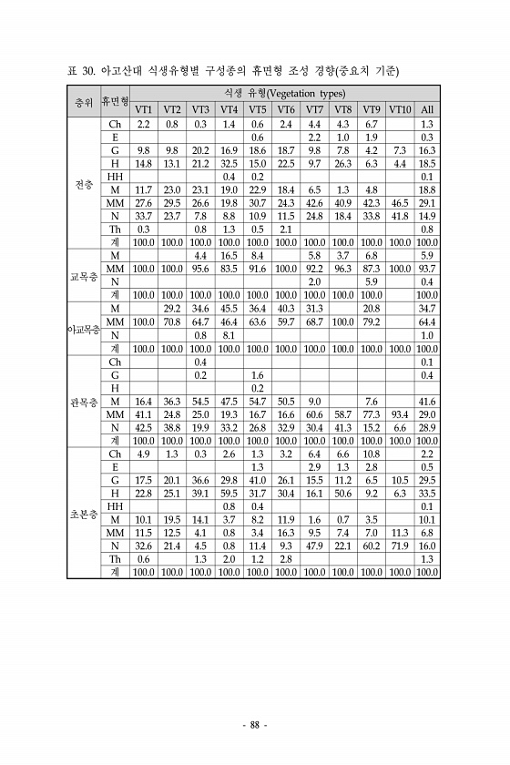 88 층위 휴면형 식생 유형 Vegetation types VT1 VT2 VT3 VT4 VT5 VT6 VT7 VT8 VT9 VT10 All 전층 Ch 2.2 0.8 0.3 1.4 0.6 2.4 4.4 4.3 6.7 1.3 E 0.6 2.2 1.0 1.9 0.3 G 9.8 9.8 20.2 16.9 18.6 18.7 9.8 7.8 4.2 7.3 16.3 H 14.8 13.1 21.2 32.5 15.0 22.5 9.7 26.3 6.3 4.4 18.5 HH 0.4 0.2 0.1 M 11.7 23.0 23.1 19.0 22.9 18.4 6.5 1.3 4.8 18.8 MM 27.6 29.5 26.6 19.8 30.7 24.3 42.6 40.9 42.3 46.5 29.1 N 33.7 23.7 7.8 8.8 10.9 11...