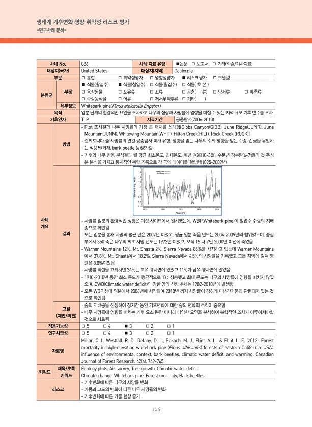 106 생태계 기후변화 영향·취약성·리스크 평가 -연구사례 분석- 사례 No. 086 사례 자료 유형 ■논문 □ 보고서 □ 기타 학술/기사자료 대상지 국가 United States 대상지 지역 California 부문 □ 통합 □ 취약성평가 □ 영향성평가 ■ 리스크평가 □ 모델링 분류군 부문 ■ 식물 활엽수 ■ 식물 침엽수 □ 식물 활엽수 □ 식물 초 본 □ 육상동물 □ 포유류 □ 조류 □ 곤충 류 □ 양서류 □ 파충류 □ 수상동식물 □ 어류 □ 저서무척추류 □ 기타 세부정보 Whitebark pine Pinus albicaulis Engelm. 목적 임분 단계의 환경적인 요인을 조사하고 나무의 성장과 사망률에 영향을 미칠 수 있는 지역 규모 기후 변수를 조사 기후인자 T, P 자료기간 공중탐사 2006-2...