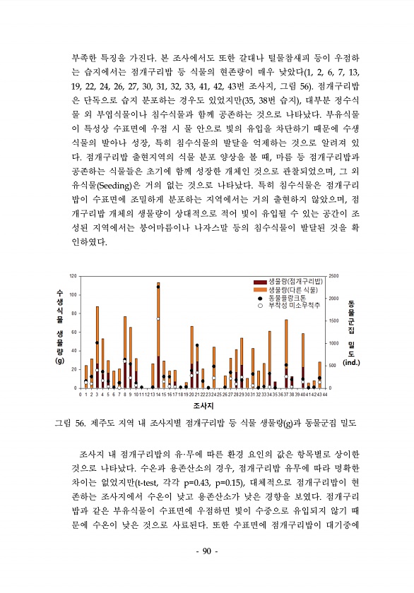 90 부족한 특징을 가진다. 본 조사에서도 또한 갈대나 털물참새피 등이 우점하 는 습지에서는 점개구리밥 등 식물의 현존량이 매우 낮았다 1, 2, 6, 7, 13, 19, 22, 24, 26, 27, 30, 31, 32, 33, 41, 42, 43번 조사지, 그림 56 점개구리밥 은 단독으로 습지 분포하는 경우도 있었지만 35, 38번 습지 , 대부분 정수식 물 외 부엽식물이나 침수식물과 함께 공존하는 것으로 나타났다. 부유식물 이 특성상 수표면에 우점 시 물 안으로 빛의 유입을 차단하기 때문에 수생 식물의 발아나 성장, 특히 침수식물의 발달을 억제하는 것으로 알려져 있 다. 점개구리밥 출현지역의 식물 분포 양상을 볼 때, 마름 등 점개구리밥과 공존하는 식물들은 초기에 함께 성장한 개체인 것으로 관찰되었으며...