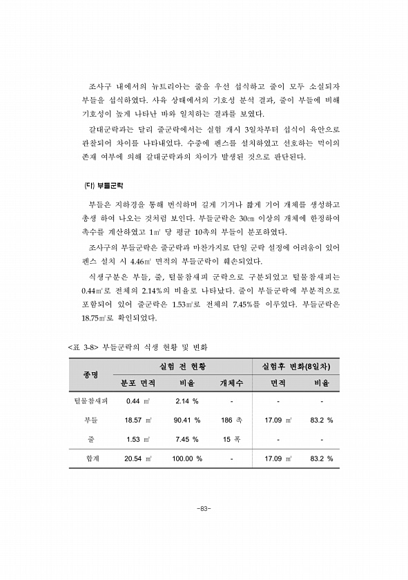 -83- 조사구 내에서의 뉴트리아는 줄을 우선 섭식하고 줄이 모두 소실되자 부들을 섭식하였다. 사육 상태에서의 기호성 분석 결과, 줄이 부들에 비해 기호성이 높게 나타난 바와 일치하는 결과를 보였다. 갈대군락과는 달리 줄군락에서는 실험 개시 3일차부터 섭식이 육안으로 관찰되어 차이를 나타내었다. 수중에 펜스를 설치하였고 선호하는 먹이의 존재 여부에 의해 갈대군락과의 차이가 발생된 것으로 판단된다. 다 부들군락 부들은 지하경을 통해 번식하며 길게 기거나 짧게 기어 개체를 생성하고 총생 하여 나오는 것처럼 보인다. 부들군락은 30㎝ 이상의 개체에 한정하여 촉수를 계산하였고 1㎡ 당 평균 10촉의 부들이 분포하였다. 조사구의 부들군락은 줄군락과 마찬가지로 단일 군락 설정에 어려움이 있어 펜스 설치 시 4.46㎡ ...