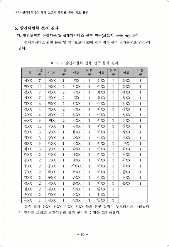 국가 생태계서비스 평가 보고서 발간을 위한 기초 연구 90 5. 발간위원회 선정 결과 가. 발간위원회 선정기준 1생태계서비스 선행 연구 보고서, 논문 등 실적 생태계서비스 관련 논문 및 연구보고서 50여 편의 저자 분석 결과는 표 Ⅴ 1 과 같다. 이름 논문 수 이름 논문 수 이름 논문 수 이름 논문 수 이름 논문 수 이XX 7 이XX 1 김X 1 신XX 1 장XX 1 전XX 10 이XX 2 김XX 1 여XX 1 장XX 1 김XX 7 이XX 2 김XX 1 육XX 1 정XX 1 이XX 7 전XX 2 김X 1 윤XX 1 정XX 1 김XX 6 정XX 2 김XX 1 이XX 1 정XX 1 김XX 4 최XX 2 김XX 1 이XX 1 정XX 1 오XX 4 최XX 2 김XX 1 이XX 1 정XX 1 문XX 3 허X 2 김...