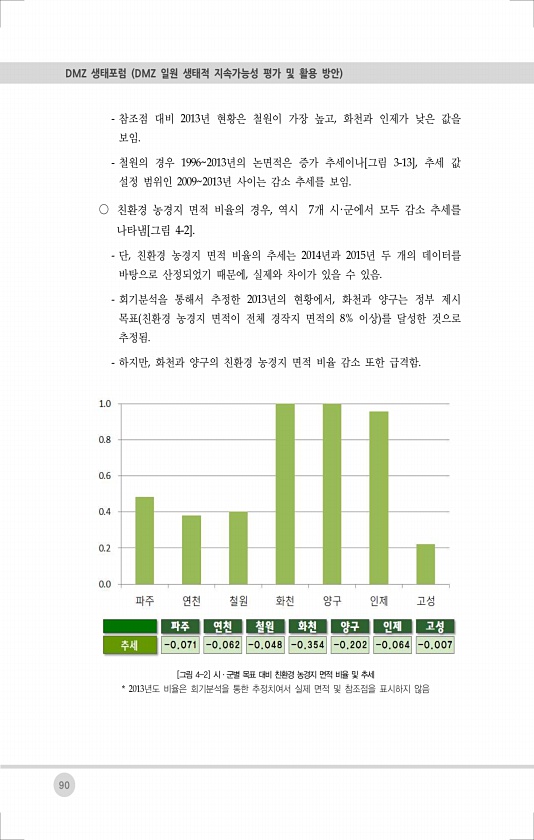 90 DMZ 생태포럼 DMZ 일원 생태적 지속가능성 평가 및 활용 방안 참조점 대비 2013년 현황은 철원이 가장 높고, 화천과 인제가 낮은 값을 보임. 철원의 경우 19962013년의 논면적은 증가 추세이나[그림 3-13], 추세 값 설정 범위인 20092013년 사이는 감소 추세를 보임. ○ 친환경 농경지 면적 비율의 경우, 역시 7개 시·군에서 모두 감소 추세를 나타냄[그림 4-2]. 단, 친환경 농경지 면적 비율의 추세는 2014년과 2015년 두 개의 데이터를 바탕으로 산정되었기 때문에, 실제와 차이가 있을 수 있음. 회기분석을 통해서 추정한 2013년의 현황에서, 화천과 양구는 정부 제시 목표 친환경 농경지 면적이 전체 경작지 면적의 8% 이상 를 달성한 것으로 추정됨. 하지만, 화천과 양구의 친...