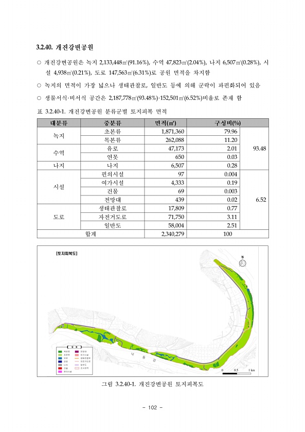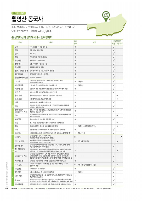 No. 군산- 군산 049 본 생태자산의 생태계서비스 간이평가지 구분 예시 평가 등급 설명 규모별 혜택 지점 지역 국가 공급 담수 식수, 농업용수, 축산 용수 등 0 √ 식량 곡물, 과실, 물고기 등 0 √ 연료 화목, 토탄 0 √ 섬유 건축용 목재, 의류용 섬유 등 0 √ 유전자원 농업·축산업 희귀품종 등 0 √ 천연약재 전통 의약품에 사용되는 식물 0 √ 장식재료 수집용 조개껍질, 꽃 등 0 √ 진흙, 미네랄, 골재 건축용 모래 또는 자갈, 벽돌재료 진흙 등 0 √ 폐기물처리 고체 쓰레기 하치, 폐수 방류 등 0 √ 친환경에너지발전 조력발전, 풍력발전 0 √ 조절 대기질 자동차 배기가스, 산업체 대기오염, 농업발생 먼지 등의 대기 미세물질의 제거 + 월명산 √ 지역적 기후 그늘, 대기온도 저하 등의 지역...