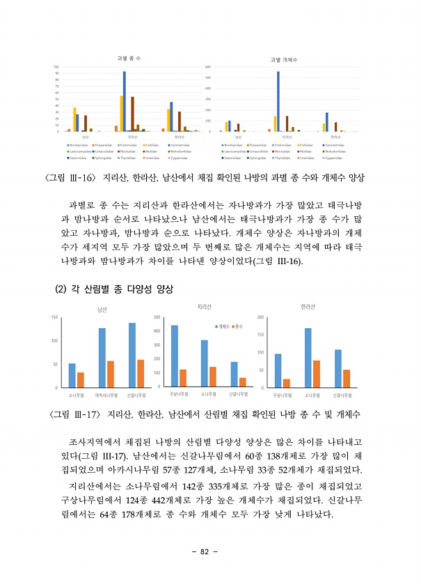 82 그림 Ⅲ-16 지리산, 한라산, 남산에서 채집 확인된 나방의 과별 종 수와 개체수 양상 과별로 종 수는 지리산과 한라산에서는 자나방과가 가장 많았고 태극나방 과 밤나방과 순서로 나타났으나 남산에서는 태극나방과가 가장 종 수가 많 았고 자나방과, 밤나방과 순으로 나타났다. 개체수 양상은 자나방과의 개체 수가 세지역 모두 가장 많았으며 두 번째로 많은 개체수는 지역에 따라 태극 나방과와 밤나방과가 차이를 나타낸 양상이었다 그림 III-16 2 각 산림별 종 다양성 양상 그림 Ⅲ-17 지리산, 한라산, 남산에서 산림별 채집 확인된 나방 종 수 및 개체수 조사지역에서 채집된 나방의 산림별 다양성 양상은 많은 차이를 나타내고 있다 그림 III-17 남산에서는 신갈나무림에서 60종 138개체로 가장 많이 채 집되...