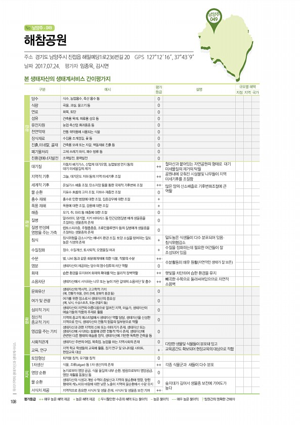 No. 남양주 남양주 049 본 생태자산의 생태계서비스 간이평가지 구분 예시 평가 등급 설명 규모별 혜택 지점 지역 국가 공급 담수 식수, 농업용수, 축산 용수 등 0 식량 곡물, 과실, 물고기 등 0 연료 화목, 토탄 0 섬유 건축용 목재, 의류용 섬유 등 0 유전자원 농업·축산업 희귀품종 등 0 천연약재 전통 의약품에 사용되는 식물 0 장식재료 수집용 조개껍질, 꽃 등 0 진흙,미네랄, 골재 건축용 모래 또는 자갈, 벽돌재료 진흙 등 0 폐기물처리 고체 쓰레기 하치, 폐수 방류 등 0 친환경에너지발전 조력발전, 풍력발전 0 조절 대기질 자동차 배기가스, 산업체 대기오염, 농업발생 먼지 등의 대기 미세물질의 제거 ++ 철마산과 붙어있는 자연공원의 형태로 대기 미세물질의 제거의 탁월 지역적 기후 그늘, 대기...