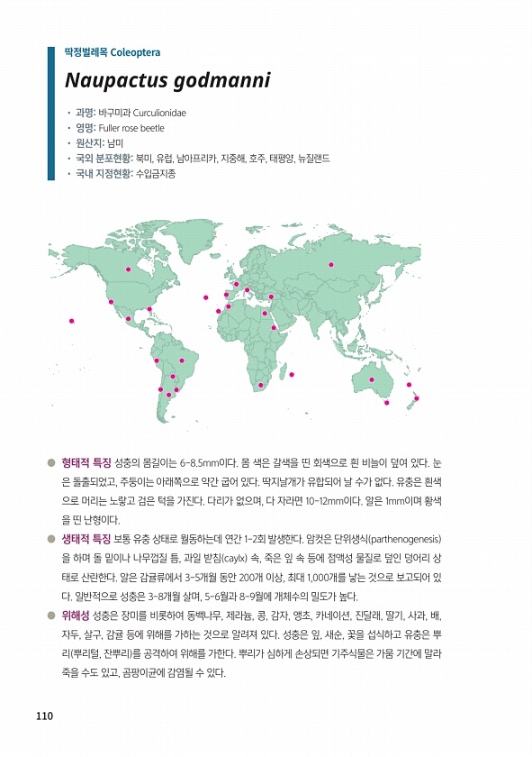110 ● 형태적 특징 성충의 몸길이는 6-8.5mm이다. 몸 색은 갈색을 띤 회색으로 흰 비늘이 덮여 있다. 눈 은 돌출되었고, 주둥이는 아래쪽으로 약간 굽어 있다. 딱지날개가 유합되어 날 수가 없다. 유충은 흰색 으로 머리는 노랗고 검은 턱을 가진다. 다리가 없으며, 다 자라면 10-12mm이다. 알은 1mm이며 황색 을 띤 난형이다. ● 생태적 특징 보통 유충 상태로 월동하는데 연간 1-2회 발생한다. 암컷은 단위생식 parthenogenesis 을 하며 돌 밑이나 나무껍질 틈, 과일 받침 caylx 속, 죽은 잎 속 등에 점액성 물질로 덮인 덩어리 상 태로 산란한다. 알은 감귤류에서 3-5개월 동안 200개 이상, 최대 1,000개를 낳는 것으로 보고되어 있 다. 일반적으로 성충은 3-8개월 살며, ...
