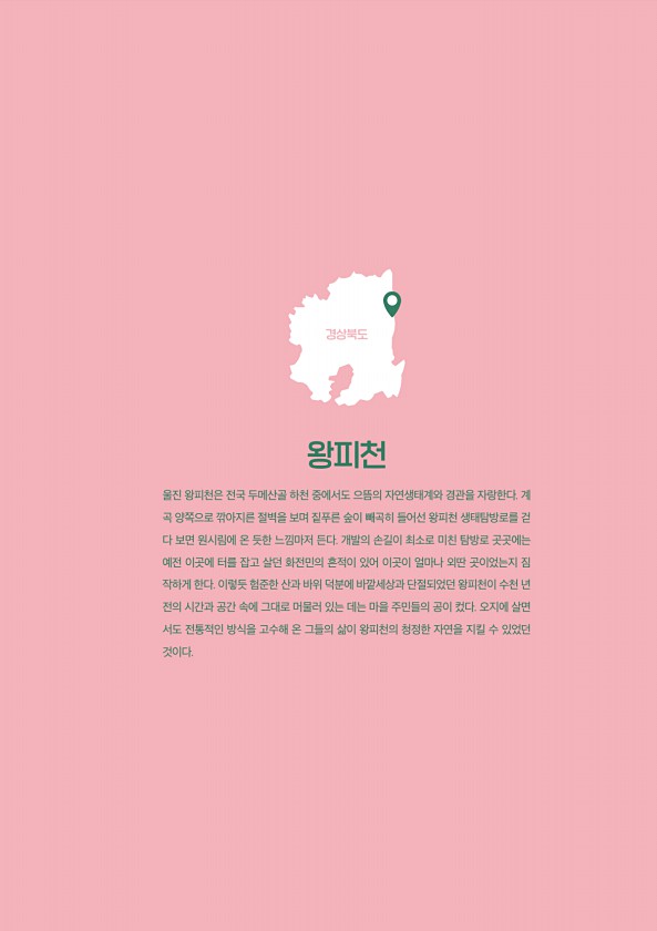 107 울진 왕피천 왕피천 울진 왕피천은 전국 두메산골 하천 중에서도 으뜸의 자연생태계와 경관을 자랑한다. 계 곡 양쪽으로 깎아지른 절벽을 보며 짙푸른 숲이 빼곡히 들어선 왕피천 생태탐방로를 걷 다 보면 원시림에 온 듯한 느낌마저 든다. 개발의 손길이 최소로 미친 탐방로 곳곳에는 예전 이곳에 터를 잡고 살던 화전민의 흔적이 있어 이곳이 얼마나 외딴 곳이었는지 짐 작하게 한다. 이렇듯 험준한 산과 바위 덕분에 바깥세상과 단절되었던 왕피천이 수천 년 전의 시간과 공간 속에 그대로 머물러 있는 데는 마을 주민들의 공이 컸다. 오지에 살면 서도 전통적인 방식을 고수해 온 그들의 삶이 왕피천의 청정한 자연을 지킬 수 있었던 것이다.경상북도