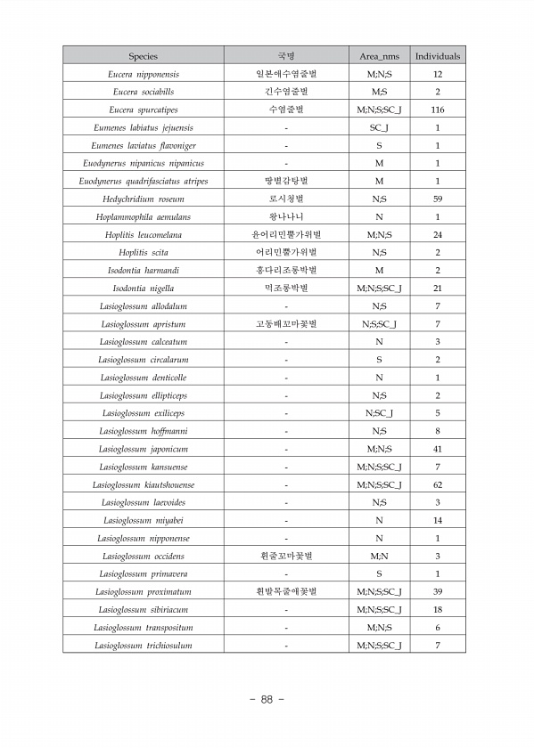 Species Area_nms Individuals Eucera nipponensis M;N;S 12 Eucera sociabills ? M;S 2 Eucera spurcatipes M;N;S;SC_J 116 Eumenes labiatus jejuensis SC_J 1 Eumenes laviatus flavoniger S 1 Euodynerus nipanicus nipanicus M 1 Euodynerus quadrifasciatus atripes M 1 Hedychridium roseum N;S 59 Hoplammophila aemulans ?? N 1 Hoplitis leucomelana M;N;S 24 Hoplitis scita N;S 2 Isodontia harmandi M 2 Isodontia ni...