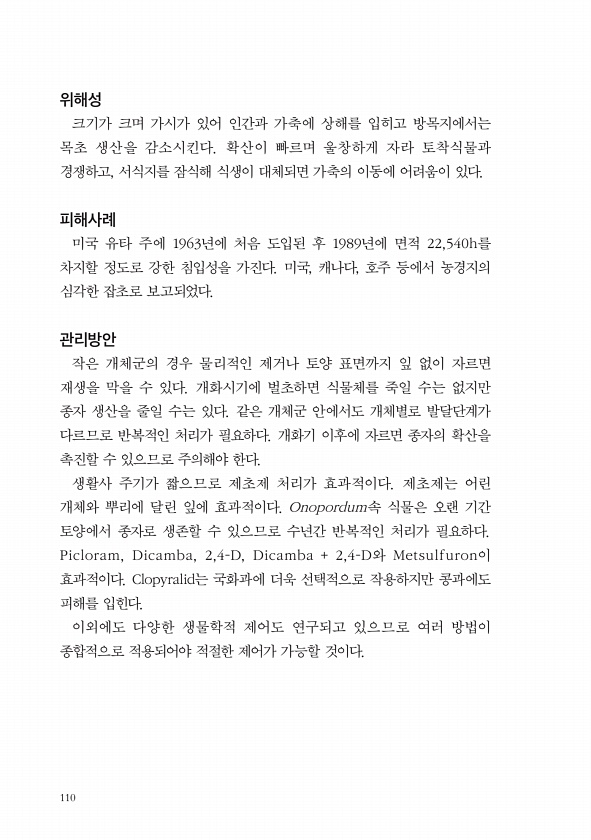 110 위해성 크기가 크며 가시가 있어 인간과 가축에 상해를 입히고 방목지에서는 목초 생산을 감소시킨다. 확산이 빠르며 울창하게 자라 토착식물과 경쟁하고, 서식지를 잠식해 식생이 대체되면 가축의 이동에 어려움이 있다. 피해사례 미국 유타 주에 1963년에 처음 도입된 후 1989년에 면적 22,540h를 차지할 정도로 강한 침입성을 가진다. 미국, 캐나다, 호주 등에서 농경지의 심각한 잡초로 보고되었다. 관리방안 작은 개체군의 경우 물리적인 제거나 토양 표면까지 잎 없이 자르면 재생을 막을 수 있다. 개화시기에 벌초하면 식물체를 죽일 수는 없지만 종자 생산을 줄일 수는 있다. 같은 개체군 안에서도 개체별로 발달단계가 다르므로 반복적인 처리가 필요하다. 개화기 이후에 자르면 종자의 확산을 촉진할 수 있으므로 ...