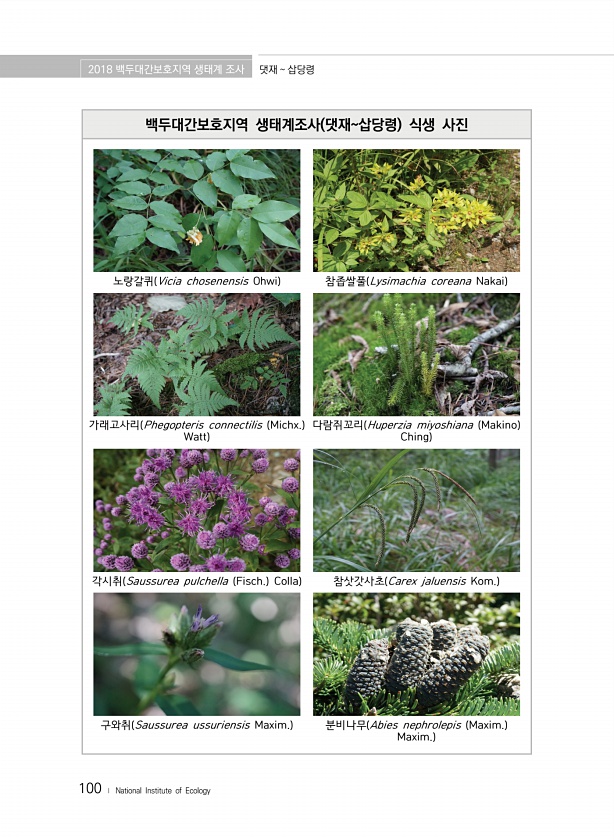 2018 백두대간보호지역 생태계 조사 댓재 삽당령 100 ? National Institute of Ecology 백두대간보호지역 생태계조사 댓재삽당령 식생 사진 노랑갈퀴 Vicia chosenensis Ohwi 참좁쌀풀 Lysimachia coreana Nakai 가래고사리 Phegopteris connectilis Michx. Watt 다람쥐꼬리 Huperzia miyoshiana Makino Ching 각시취 Saussurea pulchella Fisch. Colla 참삿갓사초 Carex jaluensis Kom. 구와취 Saussurea ussuriensis Maxim. 분비나무 Abies nephrolepis Maxim. Maxim.