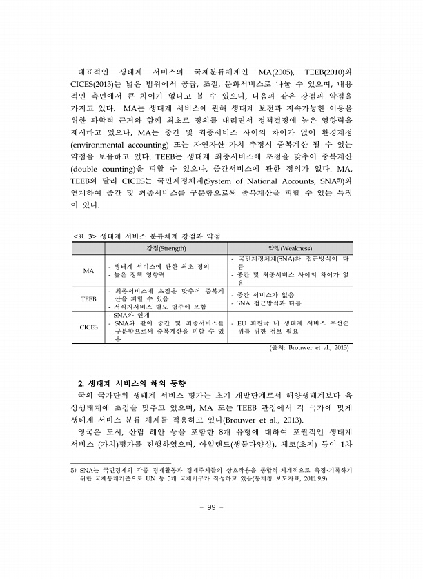 99 강점 약점 생태계 서비스에 관한 최초 정의 높은 정책 영향력 국민계정체계 와 접근방식이 다 름 중간 및 최종서비스 사이의 차이가 없 음 최종서비스에 초점을 맞추어 중복계 산을 피할 수 있음 서식지서비스 별도 범주에 포함 중간 서비스가 없음 접근방식과 다름 와 연계 와 같이 중간 및 최종서비스를 구분함으로써 중복계산을 피할 수 있 음 회원국 내 생태계 서비스 우선순 위를 위한 정보 필요 출처 표 생태계 서비스 분류체계 강점과 약점 대표적인 생태계 서비스의 국제분류체계인 와 는 넓은 범위에서 공급 조절 문화서비스로 나눌 수 있으며 내용 적인 측면에서 큰 차이가 없다고 볼 수 있으나 다음과 같은 강점과 약점을 가지고 있다 는 생태계 서비스에 관해 생태계 보전과 지속가능한 이용을 위한 과학적 근거와 함께 최초...