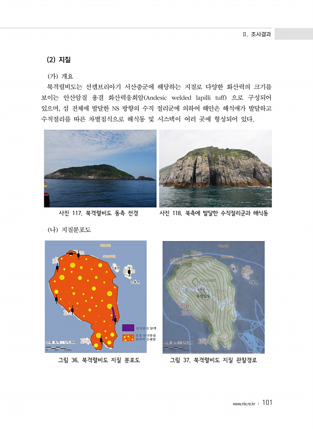 Ⅱ. 조사결과 www.nie.re.kr ? 101 2 지질 가 개요 북격렬비도는 선캠브리아기 서산층군에 해당하는 지질로 다양한 화산력의 크기를 보이는 안산암질 용결 화산력응회암 Andesic welded lapilli tuff 으로 구성되어 있으며, 섬 전체에 발달한 NS 방향의 수직 절리군에 의하여 해안은 해식애가 발달하고 수직절리를 따른 차별침식으로 해식동 및 시스텍이 여러 곳에 형성되어 있다. 사진 117. 북격렬비도 동측 전경 사진 118. 북측에 발달한 수직절리군과 해식동 나 지질분포도 그림 36. 북격렬비도 지질 분포도 그림 37. 북격렬비도 지질관찰경로