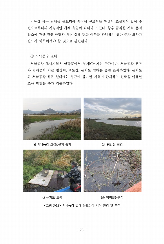 낙동강 하구 일대는 뉴트리아 서식에 선호되는 환경이 조성되어 있어 주 변으로부터의 지속적인 개체 유입이 나타나고 있다. 향후 급격한 서식 흔적 감소에 관한 원인 규명과 서식 실태 변화 여부를 파악하기 위한 추가 조사가 반드시 이루어져야 할 것으로 판단된다. ① 서낙동강 일대 서낙동강 조사지역은 안막IC에서 명지IC까지의 구간이다. 서낙동강 본류 와 김해공항 인근 평강천, 맥도강, 둔치도 일대를 중점 조사하였다. 둔치도 와 서낙동강 하류 일대에는 접근에 불가한 지역이 산재하여 선박을 이용한 조사 방법을 추가 적용하였다. ? ? ? ? ? ? ? ??