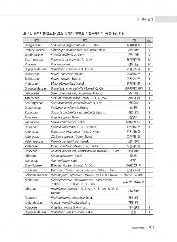 Ⅱ. 조사결과 www.nie.re.kr ? 101 과명 학명 국명 등급 Onagraceae Chamerion angustifolium L. Holub 분홍바늘꽃 Ⅴ Ranunculaceae Cimicifuga heracleifolia var. bifida Nakai 세잎승마 Ⅴ Gentianaceae Swertia wilfordii A. Kern. 큰잎쓴풀 Ⅴ Saxifragaceae Rodgersia podophylla A. Gray 도깨비부채 Ⅳ Poaceae Poa nemoralis L. 선포아풀 Ⅳ Dryopteridaceae Dryopteris amurensis H. Christ 아물고사리 Ⅳ Betulaceae Betula chinensis Maxim. 개박달나무 Ⅲ Betulaceae Betul...