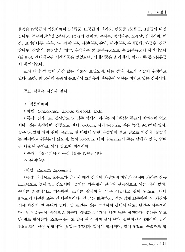 Ⅱ. 조사결과 www.nie.re.kr ? 101 물종은 IV등급의 맥문아재비 1분류군, III등급의 산기장, 천문동 2분류군, II등급의 다정 큼나무, 두루미천남성 2분류군, I등급의 갯메꽃, 돈나무, 동백나무, 모새달, 반디지치, 백 선, 보리밥나무, 부추, 사스레피나무, 사철나무, 송악, 예덕나무, 옥녀꽃대, 자금우, 장구 밥나무, 장딸기, 큰천남성, 해국, 후박나무 등 19분류군으로 총 24분류군이 확인되었다 표 II-5 생태계교란 야생식물은 없었으며, 외래식물은 소리쟁이, 방가지똥 등 2분류군 이 확인되었다. 조사 대상 섬 중에 가장 많은 식물상 보였으며, 다른 섬과 다르게 곰솔이 우점하고 있다. 또한, 칡 군락이 곳곳에 분포되어 초본층과 관목층에 영향을 미치고 있는 실정이다. 주요 식물은 다음과 ...