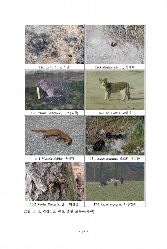 12-1 Lutra lutra, 수달 12-3 Mustela sibirica, 족제비 13-2 Rattus norvegicus, 집쥐 포획 14-2 Felis catus, 고양이 14-4 Mustela sibirica, 족제비 15-1 Meles leucurus, 오소리 배설물 15-2 Martes flavigula, 담비 배설물 17-1 Capra aegagrus, 야생염소 그림 Ⅲ- 5. 경상남도 주요 출현 포유류 계속 87