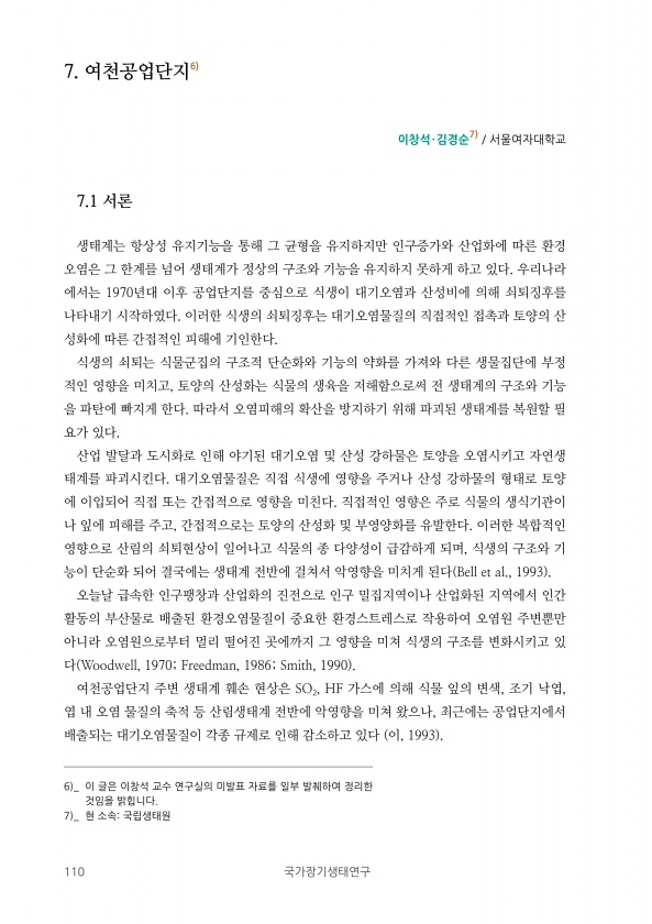110 국가장기생태연구 7. 여천공업단지6 이창석·김경순7 서울여자대학교 7.1 서론 생태계는 항상성 유지기능을 통해 그 균형을 유지하지만 인구증가와 산업화에 따른 환경 오염은 그 한계를 넘어 생태계가 정상의 구조와 기능을 유지하지 못하게 하고 있다. 우리나라 에서는 1970년대 이후 공업단지를 중심으로 식생이 대기오염과 산성비에 의해 쇠퇴징후를 나타내기 시작하였다. 이러한 식생의 쇠퇴징후는 대기오염물질의 직접적인 접촉과 토양의 산 성화에 따른 간접적인 피해에 기인한다. 식생의 쇠퇴는 식물군집의 구조적 단순화와 기능의 약화를 가져와 다른 생물집단에 부정 적인 영향을 미치고, 토양의 산성화는 식물의 생육을 저해함으로써 전 생태계의 구조와 기능 을 파탄에 빠지게 한다. 따라서 오염피해의 확산을 방지하기 위해 파...