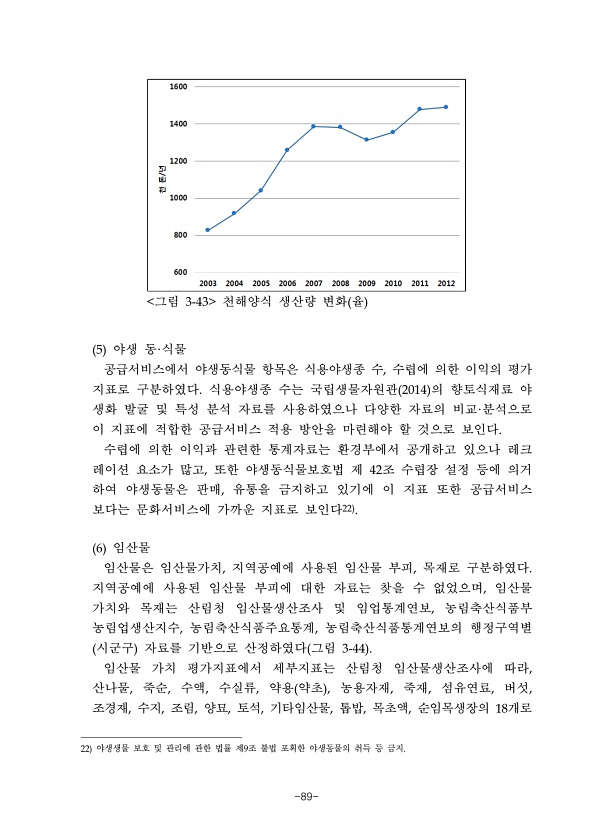 -89- 그림 천해양식 생산량 변화 율 야생 동 식물 공급서비스에서 야생동식물 항목은 식용야생종 수 수렵에 의한 이익의 평가 지표로 구분하였다 식용야생종 수는 국립생물자원관 의 향토식재료 야 생화 발굴 및 특성 분석 자료를 사용하였으나 다양한 자료의 비교 분석으로 이 지표에 적합한 공급서비스 적용 방안을 마련해야 할 것으로 보인다 수렵에 의한 이익과 관련한 통계자료는 환경부에서 공개하고 있으나 레크 레이션 요소가 많고 또한 야생동식물보호법 제 조 수렵장 설정 등에 의거 하여 야생동물은 판매 유통을 금지하고 있기에 이 지표 또한 공급서비스 보다는 문화서비스에 가까운 지표로 보인다 임산물 임산물은 임산물가치 지역공예에 사용된 임산물 부피 목재로 구분하였다 지역공예에 사용된 임산물 부피에 대한 자료는 찾을 수 없...