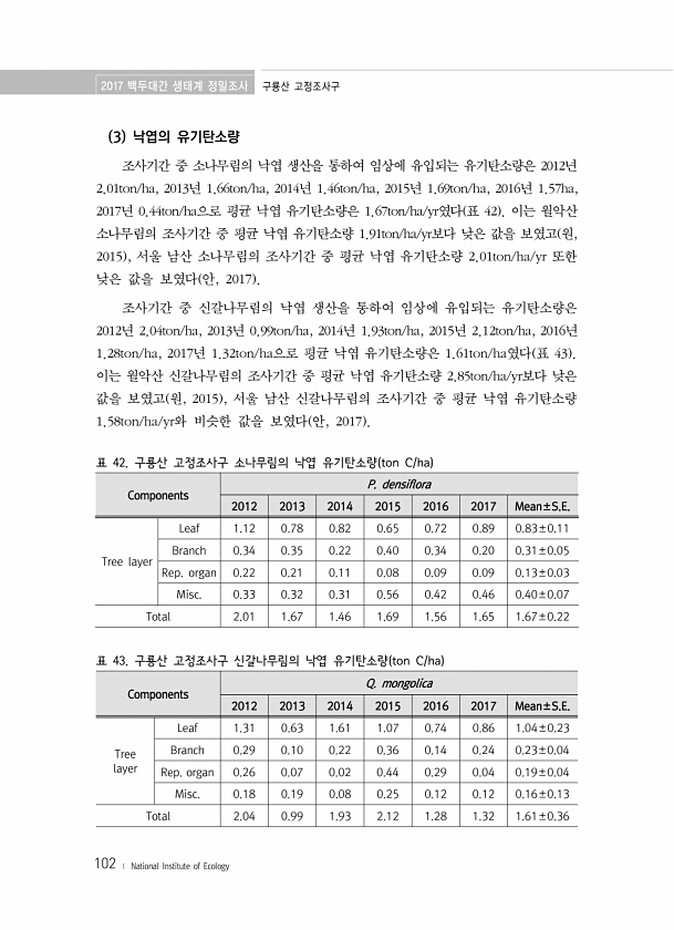 2017 백두대간 생태계 정밀조사 구룡산 고정조사구 102 ? National Institute of Ecology 3 낙엽의 유기탄소량 조사기간 중 소나무림의 낙엽 생산을 통하여 임상에 유입되는 유기탄소량은 2012년 2.01ton/ha, 2013년 1.66ton/ha, 2014년 1.46ton/ha, 2015년 1.69ton/ha, 2016년 1.57ha, 2017년 0.44ton/ha으로 평균 낙엽 유기탄소량은 1.67ton/ha/yr였다 표 42 이는 월악산 소나무림의 조사기간 중 평균 낙엽 유기탄소량 1.91ton/ha/yr보다 낮은 값을 보였고 원, 2015 , 서울 남산 소나무림의 조사기간 중 평균 낙엽 유기탄소량 2.01ton/ha/yr 또한 낮은 값을 보였다 안, 2017 조사기간 중 신갈나...