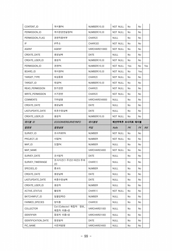 99 CONTENT_ID 게시물PK NUMBER 10,0 NOT NULL No No PERMISSION_ID 게시판권한설정PK NUMBER 10,0 NOT NULL No No PERMISSION_FLAG 권한적용여부 CHAR 2 NULL No No IP IP주소 CHAR 32 NOT NULL No No AGENT AGENT VARCHAR2 1000 NOT NULL No No CREATE_DATE 생성날짜 DATE NULL No No CREATE_USER_ID 생성자 NUMBER 10,0 NOT NULL No No PERMISSION_ID 권한PK NUMBER 10,0 NOT NULL Yes No Yes BOARD_ID 게시판PK NUMBER 10,0 NOT NULL No Yes TARGET_TYPE 대상종류...