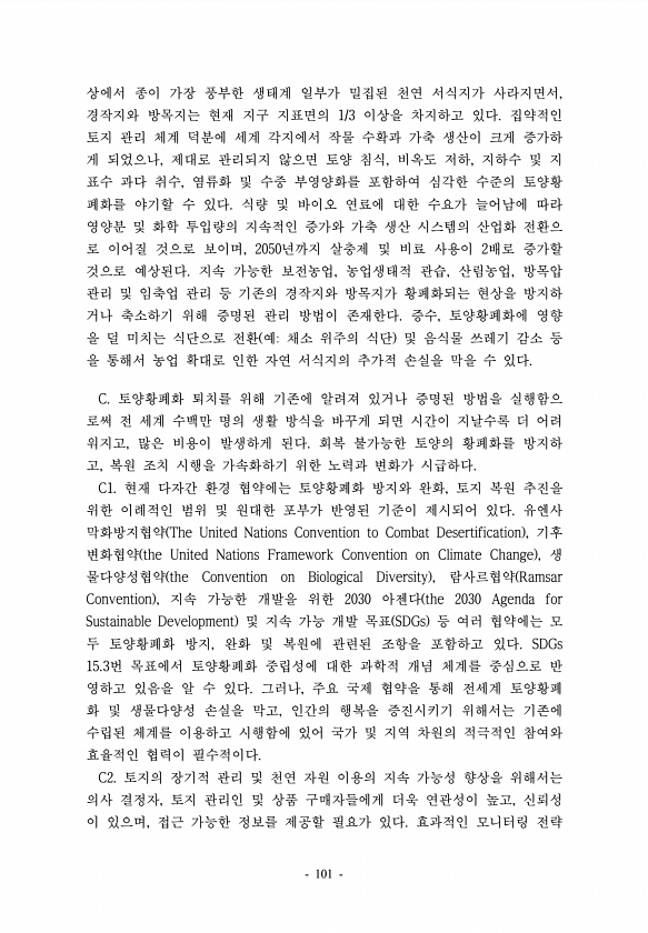 상에서 종이 가장 풍부한 생태계 일부가 밀집된 천연 서식지가 사라지면서, 경작지와 방목지는 현재 지구 지표면의 1/3 이상을 차지하고 있다. 집약적인 토지 관리 체계 덕분에 세계 각지에서 작물 수확과 가축 생산이 크게 증가하 게 되었으나, 제대로 관리되지 않으면 토양 침식, 비옥도 저하, 지하수 및 지 표수 과다 취수, 염류화 및 수중 부영양화를 포함하여 심각한 수준의 토양황 폐화를 야기할 수 있다. 식량 및 바이오 연료에 대한 수요가 늘어남에 따라 영양분 및 화학 투입량의 지속적인 증가와 가축 생산 시스템의 산업화 전환으 로 이어질 것으로 보이며, 2050년까지 살충제 및 비료 사용이 2배로 증가할 것으로 예상된다. 지속 가능한 보전농업, 농업생태적 관습, 산림농업, 방목압 관리 및 임축업 관리 등 기존의...