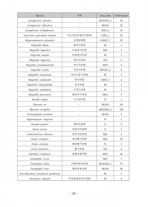 Species Area_nms Individuals Lasioglossum upinense M;N;S;SC_J 10 Lasioglossum villosulum M;N;S 22 Lasioglossum virideglaucum N;SC_J 19 Lipotriches yasumatsui koreana ? N;SC_J 15 Megacampsomeris prismatica ? N;S;SC_J 32 Megachile abluta M 1 Megachile lapponica M;S 3 Megachile maackii M 1 Megachile nipponica N;S 3 Megachile pseudomonticola M;N 2 Megachile remota ? M;N;SC_J 8 Megachile remotissima ? ...