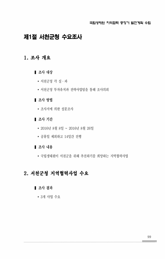 국립생태원 지역협력 중장기 발전계획 수립 99 제1절 서천군청 수요조사 1. 조사 개요 ? 조사 대상 ? 서천군청 각 실·과 ? 서천군청 투자유치과 전략사업팀을 통해 조사의뢰 ? 조사 방법 ? 조사지에 의한 설문조사 ? 조사 기간 ? 2016년 8월 8일 2016년 8월 26일 ? 공휴일 제외하고 14일간 진행 ? 조사 내용 ? 국립생태원이 서천군을 위해 추진하기를 희망하는 지역협력사업 2. 서천군청 지역협력사업 수요 ? 조사 결과 ? 3개 사업수요