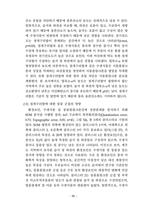 91 산소 유입을 차단하기 때문에 용존산소의 농도는 상대적으로 낮을 수 있다. 일반적으로, 습지와 하천을 비교할 때, 하천은 흐름이 있고, 수표면이 개방 되어 있기 때문에 용존산소가 높으며, 습지는 흐름이 없고 수심이 얕은 탓 에 수생식물이 빈번하게 우점하기 때문에 낮은 경향을 나타낸다. 전기전도 도는 점개구리밥이 존재하는 공간에서 더 높은 것으로 나타났다 t-test, p=0.03 점개구리밥과 같은 수생식물은 물속에 침수된 줄기나 뿌리 등이 수중에 부유하는 유기물 입자를 고정하기 때문에 이 부분이 이온 함량 높게 측정되어 전기전도도가 높은 것으로 보인다. 이와 비슷하게 탁도 또한 점개 구리밥이 우점하는 습지 및 하천에서 높은 성향을 나타냈다. 엽록소-a 또한 영양염류의 농도에 의존적이나, 점개구리밥과 같은...