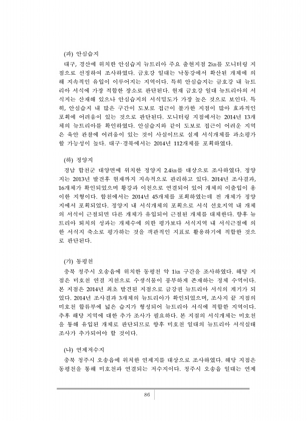 86 파 안심습지 대구, 경산에 위치한 안심습지 뉴트리아 주요 출현지점 2㎞를 모니터링 지 점으로 선정하여 조사하였다. 금호강 일대는 낙동강에서 확산된 개체에 의 해 지속적인 유입이 이루어지는 지역이다. 특히 안심습지는 금호강 내 뉴트 리아 서식에 가장 적합한 장소로 판단된다. 현재 금호강 일대 뉴트리아의 서 식지는 산재해 있으나 안심습지의 서식밀도가 가장 높은 것으로 보인다. 특 히, 안심습지 내 많은 구간이 도보로 접근이 불가한 지점이 많아 효과적인 포획에 어려움이 있는 것으로 판단된다. 모니터링 지점에서는 2014년 13개 체의 뉴트리아를 확인하였다. 안심습지와 같이 도보로 접근이 어려운 지역 은 육안 관찰에 어려움이 있는 것이 사실이므로 실제 서식개체를 과소평가 할 가능성이 높다. 대구·경북에서는 2...
