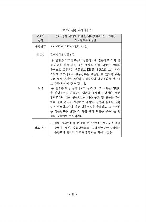90 발명의 명칭 랩퍼 명세 언어에 기반한 인터넷상의 반구조화된 생물정보추출방법 출원번호 KR 2003-0078055 현재 소멸 출원인 한국전자통신연구원 요약 본 발명은 네트워크상의 생물정보에 접근하고 이의 분 석/가공을 위한 기본 정보 생성을 위해, 다양한 형태와 방식으로 표현되는 생물정보 DB 를 대상으로 보다 안정 적이고 효과적으로 생물정보를 추출할 수 있도록 하는 랩퍼 명세 언어에 기반한 인터넷상의 반구조화된 생물정 보 추출 방법에 관한 것이다. 본 발명은 대상 생물정보의 구조 및 그 내재된 시멘틱 을 선언적으로 기술하여 랩퍼를 명세하는 단계와, 랩퍼 명세로부터 대상 생물정보에 대한 구조 및 연산을 파싱 하여 실제 랩퍼를 생성하는 단계와, 생성된 랩퍼를 실행 하여 네트워크상의 대상 생물정보를 추출하고...